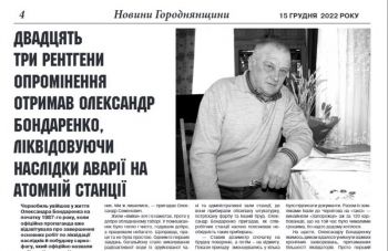 Дубровський П. Двадцять три рентгени опромінення отримав Олександр Бондаренко, ліквідовуючи наслідки аварії на атомній станції / Павло Дубровський // Новини Городнянщини. – 2022. – 15 груд. (№ 39). – С. 4: фот.