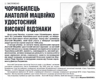 Іваненко М. Чорнобилець Анатолій Мацвійко удостоєний високої відзнаки / Марина Іваненко // Поліська правда. – 2021. – 5 серп. (№ 31). – С. 2.