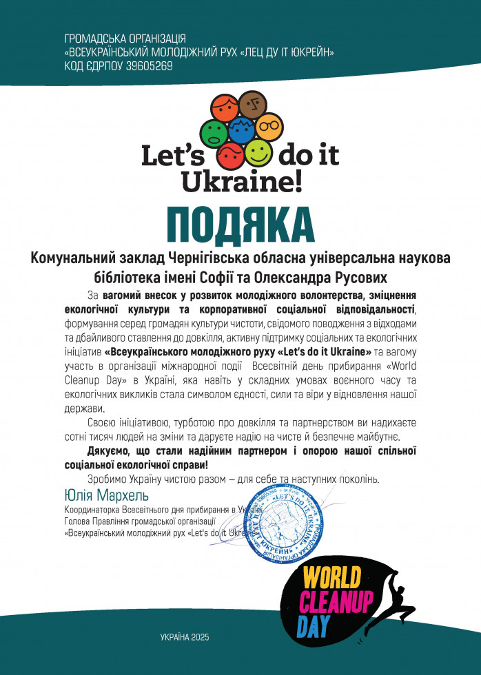 Бажаємо колективу Вашої бібліотеки подальших успіхів і перемог на благо України і Чернігівщини, всім його співробітникам здоров'я, щастя й благополуччя!