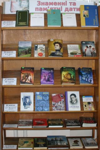 На книжковій виставці "Знаменні та пам’ятні дати" представлені документи, присвячені окремим ювілейним датам, подіям, пам’ятним дням, які відзначаються у жовтні в Україні й за кордоном. Усі ці книжки можна взяти у відділі абонемента Чернігівської ОУНБ імені Софії та Олександра Русових.