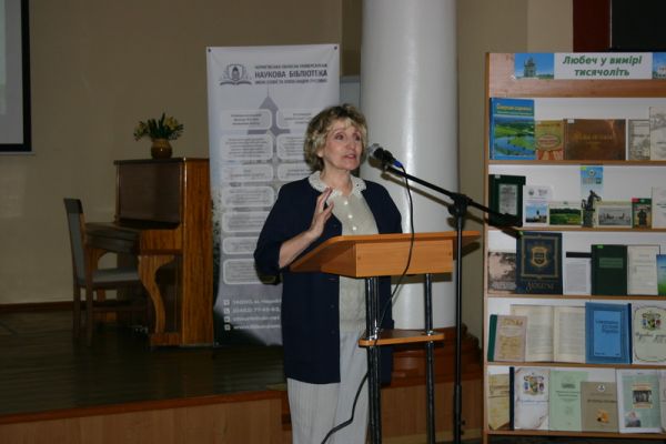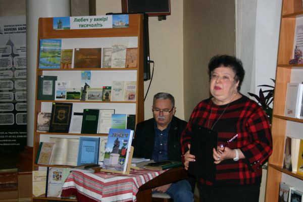 У залі демонструвалася книжково-ілюстративна виставка "Любеч у вимірі тисячоліть", яку прокоментувала модератор заходу – завідувачка відділу краєзнавства бібліотеки Ірина Каганова.