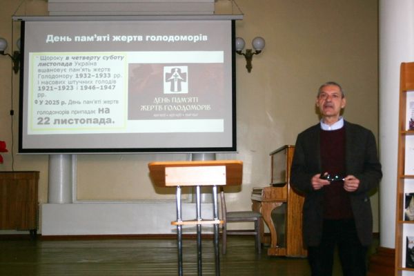 Ведуча заходу Татаренкова Юлія, бібліотекар відділу документів із гуманітарних наук, розпочала захід коротким екскурсом тих трагічних подій в історії радянської України та запросила до слова історика Сергію Бутко – представника Українського інституту національної пам'яті в Чернігівській області. Сергій Володимирович прочитав лекцію на тему "Голодомор 1932–1933 років і масові штучні голоди 1921–1923 і 1946–1947 років в Україні" з демонстрацією презентації. Були названі передумови, історичні підтвердження та наслідки голодоморів. Засуджена політика комуністичного тоталітарного режиму до українських селян, метою якої було знищення українського народу як національної групи. Особлива увага була надана жертвам голодомору в Чернігівській області.