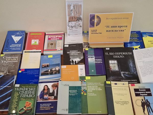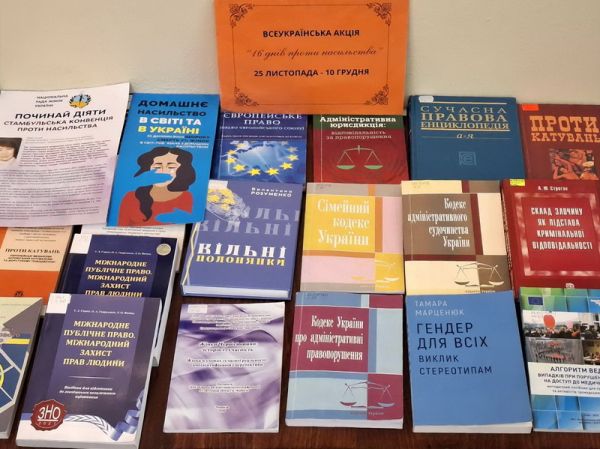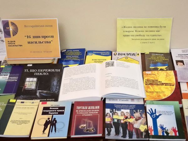У центрі правової інформації діє книжково-інформаційна виставка "16 днів проти насильства". На ній представлені книги та періодичні видання, які висвітлюють проблеми домашнього насильства, гендерної дискримінації, а також способи їх подолання. Особливу увагу приділено темам прав людини, формуванню культури ненасильства та підтримки постраждалих. Читачі мають можливість дізнатися: що таке насильство; що робити у випадку насильства у сім'ї; куди звертатися по допомогу у випадку проявів насильства.