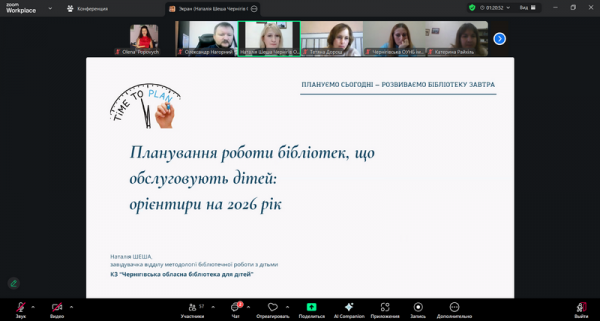 Наталія Шеша, завідувачка відділу методології бібліотечної роботи з дітьми Чернігівської ОБД, поділилася рекомендаціями та акцентами щодо планування діяльності бібліотек для дітей у 2026 році, зокрема щодо програм читання, безпеки дітей та обласних і всеукраїнських конкурсів.
