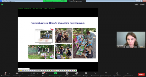 Про сучасні соціокультурні практики та залучення молоді розповіла Тетяна Шишова, бібліотекарка відділу соціокультурної діяльності обласної бібліотеки для юнацтва. Вона представила формат OpenAir як інноваційну технологію популяризації читання та бібліотеки, що дозволяє виходити за межі приміщення й працювати в просторі громади.