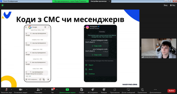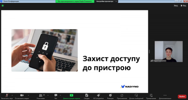 Продовжили тему спеціалісти з цифрової безпеки проєкту Nadiyno – Надія Романюк та Микола Рожнюк, які дали учасникам практичні поради щодо безпеки власних пристроїв, захисту електронних даних та протидії поширеним онлайн-ризикам.