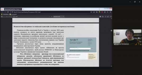 Головна бібліотекарка науково-методичного відділу ОУНБ Марина Латамарчук представила учасникам актуальні підходи до планування роботи публічних бібліотек на 2026 рік. У своїй доповіді вона окреслила пріоритетні напрями діяльності бібліотек, серед яких: розвиток послуг відповідно до запитів мешканців, впровадження інструментів цифрової трансформації, а також реалізація програм, спрямованих на підтримку ментального здоров'я, соціальну згуртованість, роботу з ветеранами та їхніми родинами.