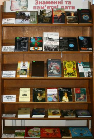 На книжковій виставці "Знаменні та пам'ятні дати" представлені документи, присвячені окремим ювілейним датам, подіям, пам'ятним дням, які відзначаються у грудні в Україні й за кордоном. Усі ці книжки можна взяти у відділі абонемента Чернігівської ОУНБ імені Софії та Олександра Русових.