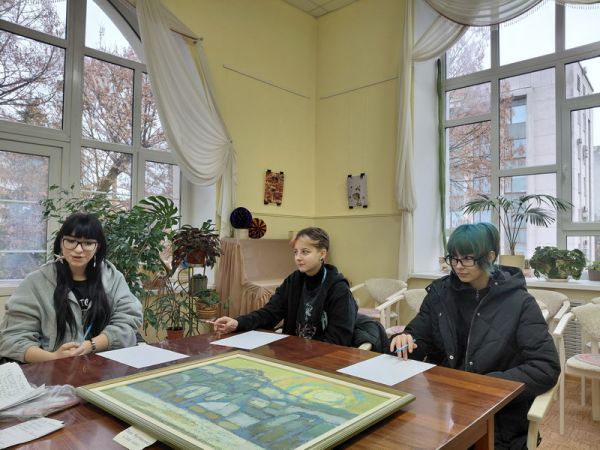 До слова, така співпраця відбулася не вперше: Мистецька вітальня вже приймала раніше у своїх стінах студенток-мисткинь, адже пан Анатолій – давній користувач і друг бібліотеки, постійний учасник та спікер на краєзнавчих і мистецьких подіях, що проходять у бібліотеці Русових. Та й у фонді відділу мистецтв зберігається чимала добірка подарованих творів мистецтва українських художниць і художників, зокрема й картин. Для опису взяли цікаву та унікальну картину "Сонце сідає" членкині Національної спілки художників України Надії Мартиненко.