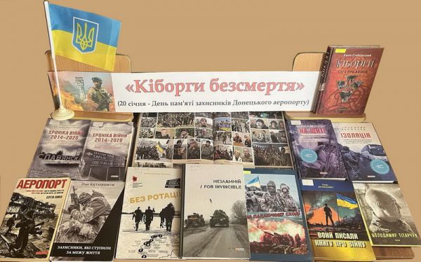 Працівниці відділу документів із гуманітарних наук Чернігівської ОУНБ імені Софії та Олександра Русових підготували книжкову викладку "Кіборги безсмертя", присвячену вшануванню пам'яті українських військових, які героїчно обороняли летовище, їхній стійкості і незламності, що стали символом мужності й патріотизму, відданості ідеалам вільної та незалежної України.