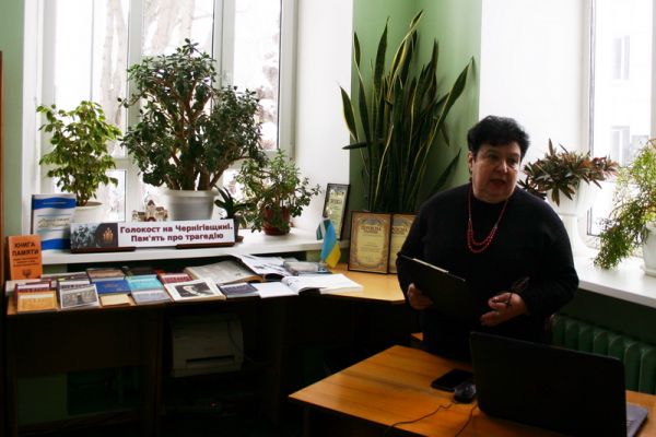 З книжково-інформаційною виставкою "Голокост на Чернігівщині. Пам'ять про трагедію" присутніх ознайомила завідувачка відділу краєзнавства Ірина Каганова, а доцентка кафедри всесвітньої історії й міжнародних відносин