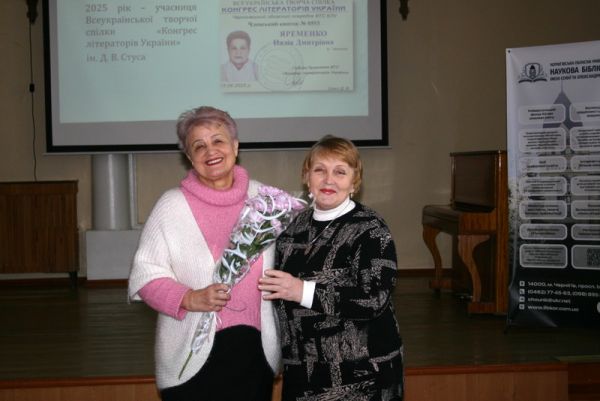 До привітань долучилася голова профспілкової організації бібліотеки Олена Попович. "Бібліотека — це місце, де думки стають книгами, а книги — чиїмось цілим світом. Нехай Ваш творчий вогник ніколи не згасає, а з кожним днем перетворюється на впевнене полум’я натхнення".