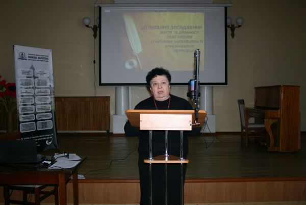 Завідувачка відділу краєзнавства Чернігівської ОУНБ імені Софії та Олександра Русових Ірина Каганова висвітлила тему "До питання дослідження життя та діяльності Софії Русової сучасними науковцями та краєзнавцями Чернігівщини" та презентувала книжкову експозицію "Софія з Олешні", підготовлену працівницями відділу краєзнавства.